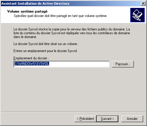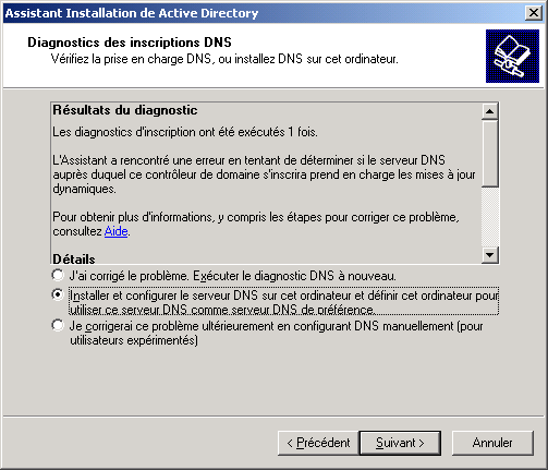 Confirmez l'emplacement du dossier SYSVOL, et cliquez sur Suivant : DCPROMO va ensuite tester le DNS qui est renseigné dans vos propriétés réseau, si celui-ci ne remplis pas les conditions requises pour AD, il vous propose d'en créer un sur votre serveur (dans l'exemple ci dessous, le Serveur redirigeait ses requêtes directement vers le fournisseur d'accès.