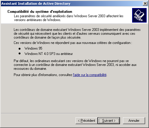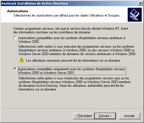 Si votre réseau ne contient pas de clients NT4, Windows 95, 98 ou Me, cliquez sur Autorisations compatibles uniquement avec les systèmes d'exploitation serveurs Windows 2000 ou Windows Server 2003. Cliquez sur Suivant :
