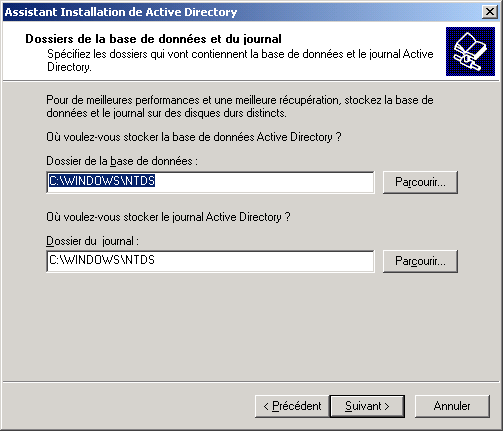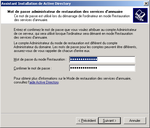 Confirmez ensuite le mot de passe qui sera utilisé en mode Restauration et ne l'oubliez pas !!! Voir la FAQ : Q23 - Comment restaurer AD ? pour plus de détails. Cliquez sur Suivant :