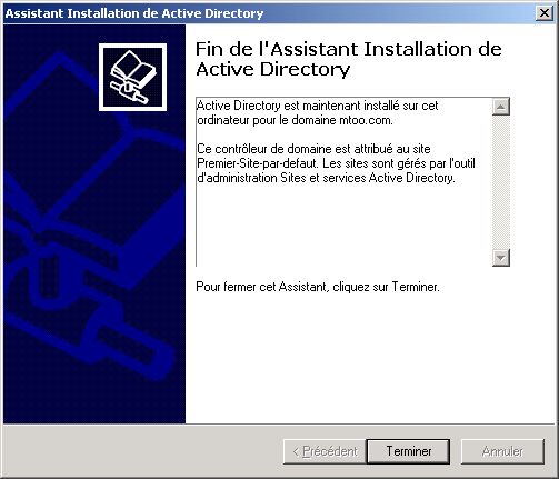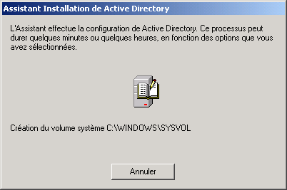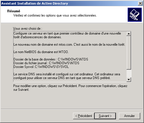 L'assistant affiche ensuite le résumé des informations que vous avez saisi (vous pouvez copier / coller le texte dans un document, pour mémoire). Lorsque vous cliquez sur Suivant, l'initialisation d'Active Directory commence :