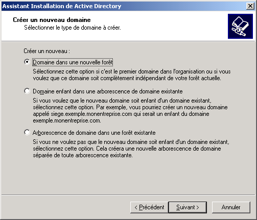 Sélectionnez l'option Domaine dans une nouvelle forêt et cliquez sur Suivant :