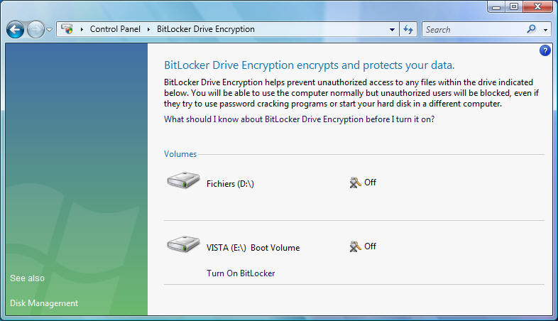 Windows Vista bitlocker encryption cryptage protection microsoft