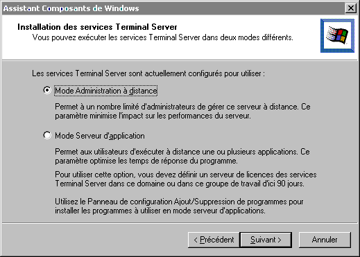 Si vous n'avez pas installé les services Terminal serveur, lors de l'installation de Windows 2000, allez dans Ajout / Suppression de programmes dans le Panneau de Configuration. Lorsque vous installez le service dans Ajout / Suppression de programmes, l'assistant vous demande alors de choisir le type d'installation désirée :