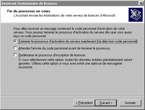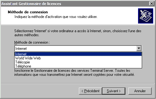 Choisissez la méthode que désirée pour l'obtention des licences (Internet est conseillé, si votre serveur en dispose),