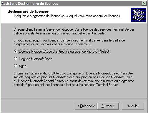 votre serveur de licences pour les services Terminal Choisissez alors le premier choix puis entrez le code dans l'écran suivant :