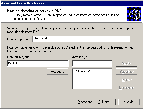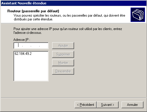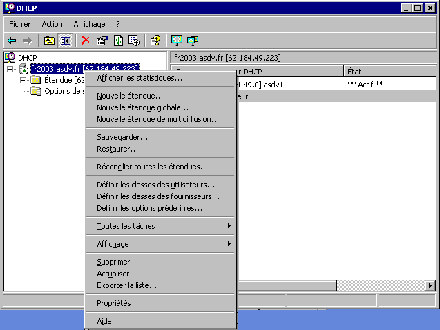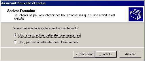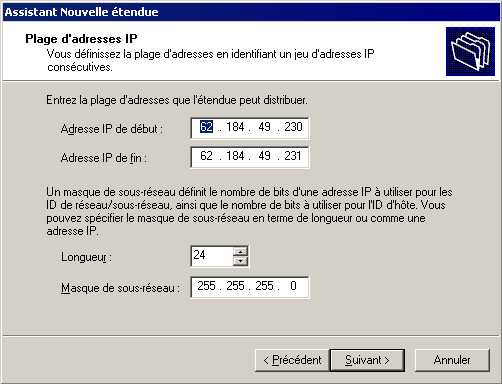 Il faut ensuite créer une étendue : dans la console d'administration (System32\dhcpmgmt), cliquez sur le serveur avec le bouton droit et choisissez Nouvelle étendue ![]() Vous donnez ensuite la plage d'adresses IP que vous souhaitez générer :