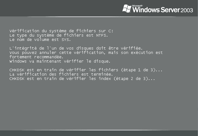 puis vérification des fichiers de la partition principale (notez le nom de la version affiché : Windows Server 2003)