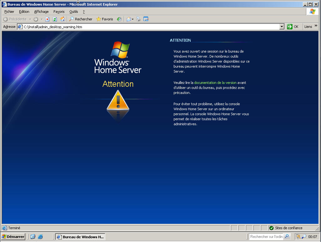 En principe, c'est tout ! Vous pouvez débrancher le clavier, la souris et l'écran, si vous souhaitez faire une utilisation basique de votre serveur (et ainsi personne ne sera tenté de "bidouiller sur le serveur). Si vous ouvrez une session sur le serveur, le message suivant s'affiche :