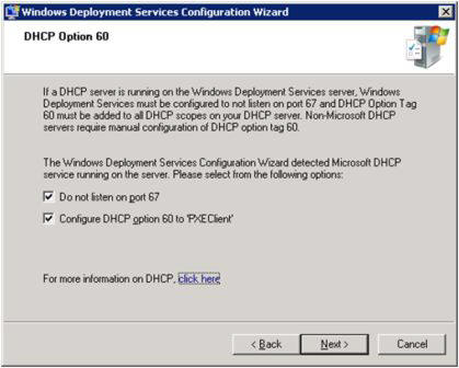 _ si votre serveur WDS est aussi un serveur DHCP, alors un écran vous demande de configurer l'option DHCP 60 : PXEClient, et demander au serveur WDS de ne pas écouter sir le port 67.