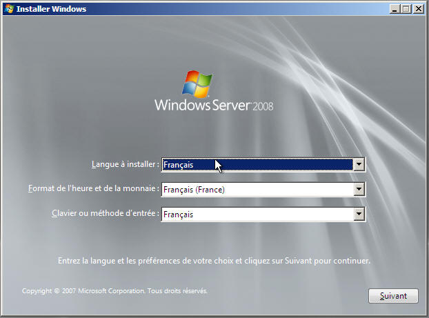 Choisissez Installer : Saisissez la clef de produit, ou pas de clef pour une évaluation. Si vous n'avez pas saisi de clef, alors vous devez choisir la version de Windows à Installer, sinon celle ci est imposée par la clef et vous n'avez le choix qu'entre la version Core (traduite installation minimale) ou l'installation complète. Choisissez le type d'installation (le choix Upgrade est disponible uniquement avec un lancement du programme depuis une version de Windows installée sur le disque dur). Le choix Options de lecteur vous permet d'accéder aux fonctions de création ou extension de partition, ou formatage.